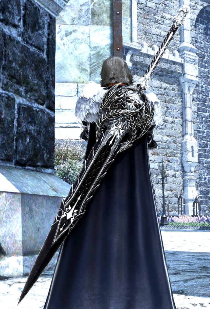 In-game weapon model: Augmented Radiant's Greatsword, dyed Soot BlackThis greatsword was a gift from House Vilant to Torsten when he was knighted. The two dragons encircling the base of the blade represent the pair that Torsten himself fended off from the House's patriarch, and thus began their relationship. It is Torsten's primary weapon, and the one he is seen with the vast majority of the time. He is well used to its weight by now, though at first the knight struggled with its heft. Before being knighted, he was used to far lesser quality blades. The materials used were expensive and possess some rarity to them. This is best shown by the blade's ability to amplify and carry large amounts of aether without toil.